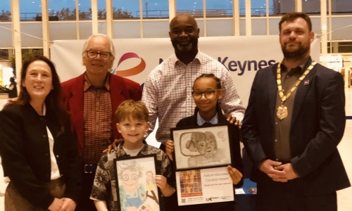Both children were presented with their prizes by our local MP, Emily Darlington, and the Mayor of Milton Keynes, Cllr James Lancaster, in a special ceremony celebrating young artists at Middleton Hall.