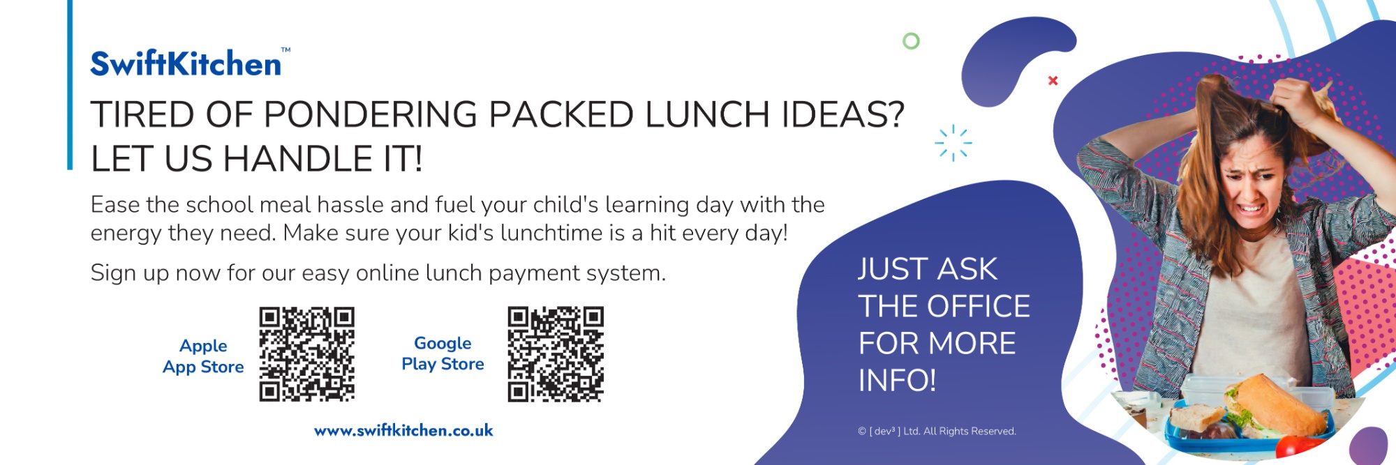 Meals must be ordered in advance through the Swift Kitchen App. The cut-off time is 8am on the day the school dinner is required.